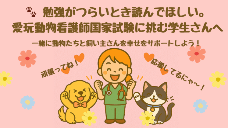 応援メッセージ 🐾 勉強がつらいとき読んでほしい。愛玩動物看護師国家試験に挑む学生さんへ 愛玩動物看護師国家試験の勉強がつらい学生さんへ。心が軽くなる言葉と勉強の続け方をやさしくお届けします。 2025.11.08 2025.11.11 応援メッセージ愛玩動物看護師を目指す学生さんへ