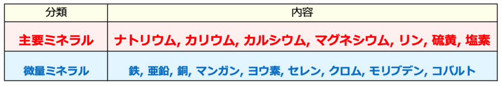 ミネラルは、主要ミネラルと微量ミネラルに分類されるよ。