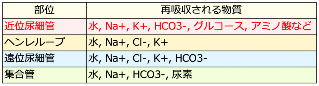 ※全部の箇所で水とNa+(ナトリウムイオン)が再吸収されてる!そして近位尿細管はめっちゃがんばってるよね〜ていうのがこれみたらわかるね!