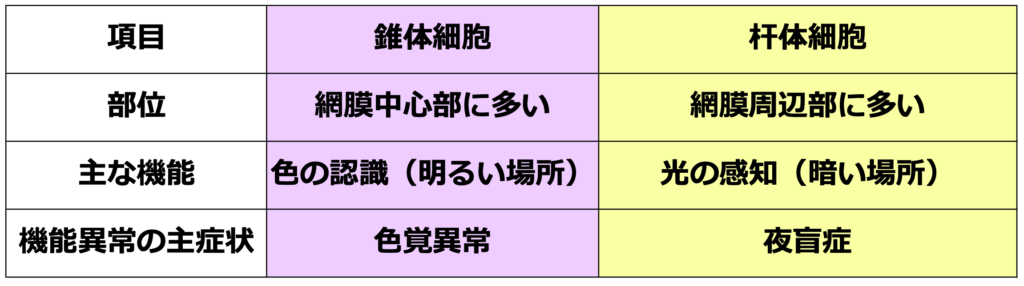 ◉視細胞の役割を表にまとめるとこんな感じ👇