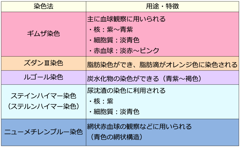 ※表の色は大体染色された時の色に合わせているけど、同じ染色法でも物によって染まる色が違うものもあるから注意してね!