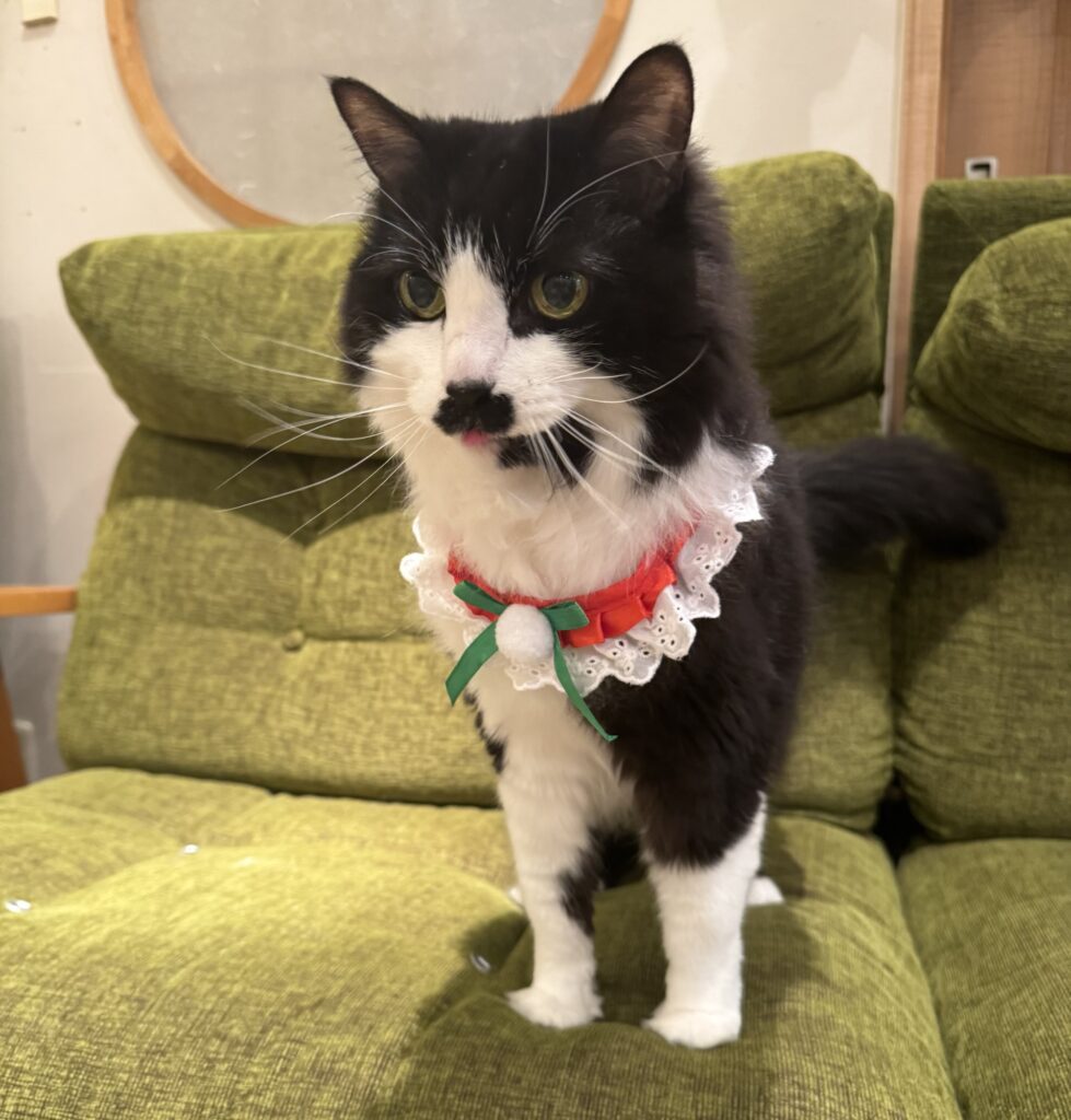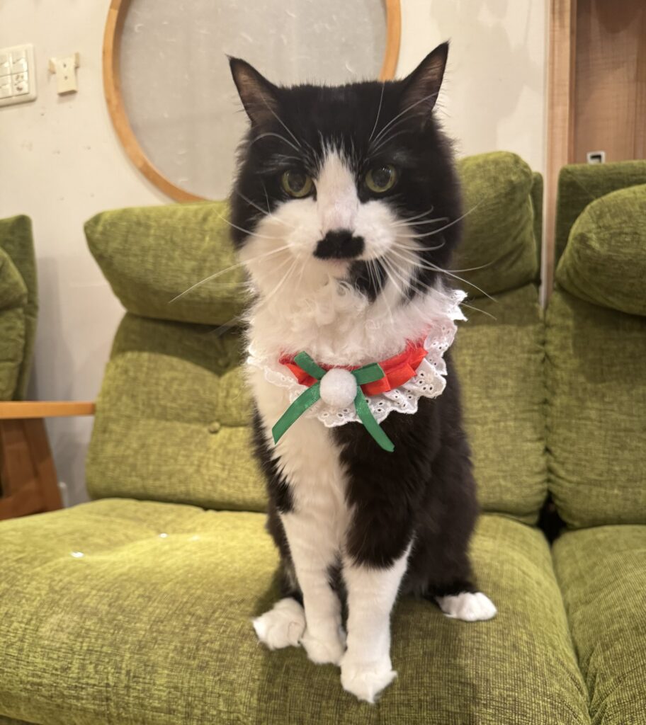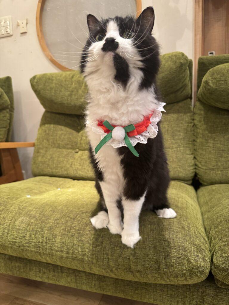 この日は、赤と緑のクリスマス首輪をつけてみました。