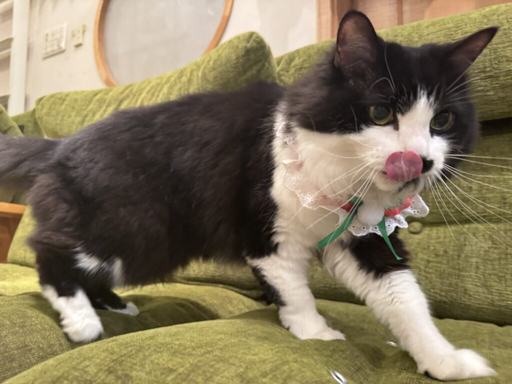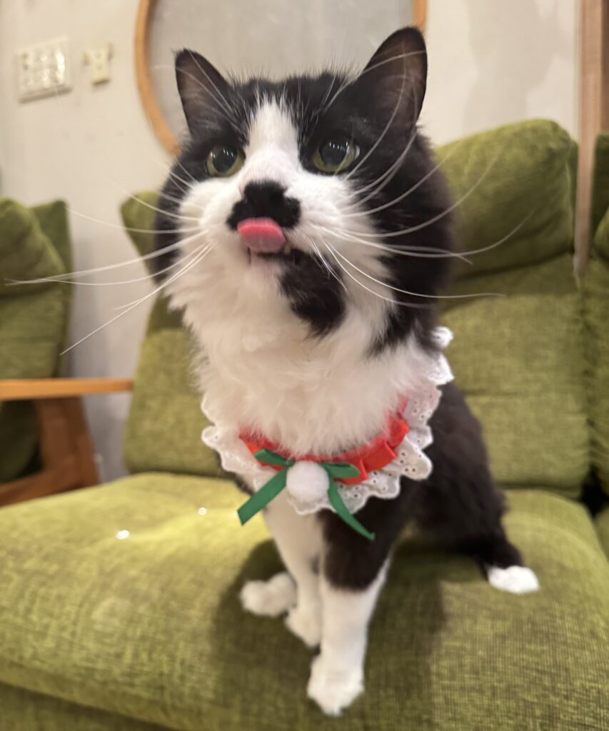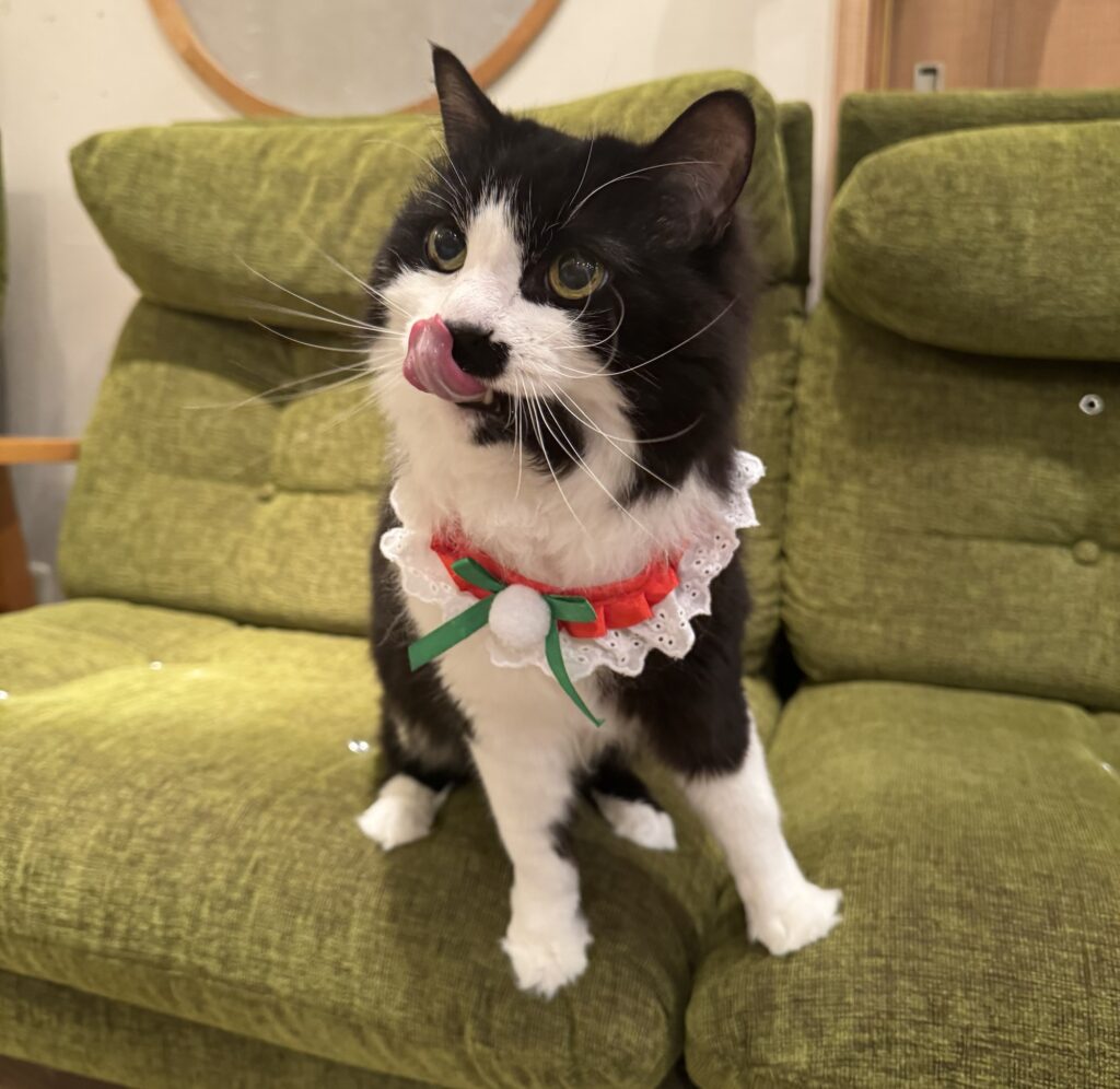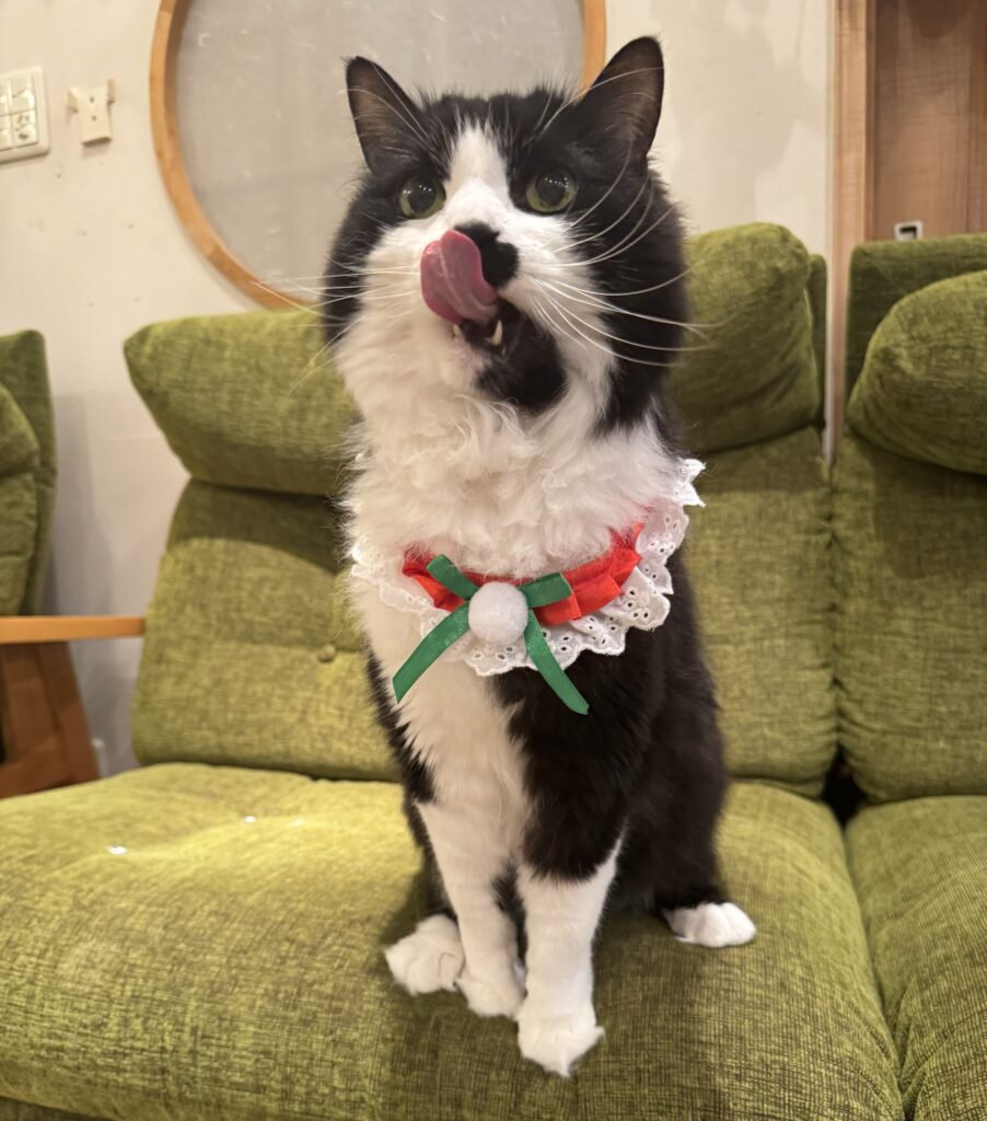 この日は、赤と緑のクリスマス首輪をつけてみました。