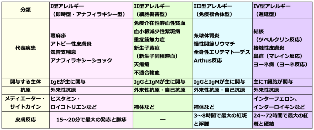 疾患や症状が何型のアレルギーに分類されるかしっかり覚えよう☆