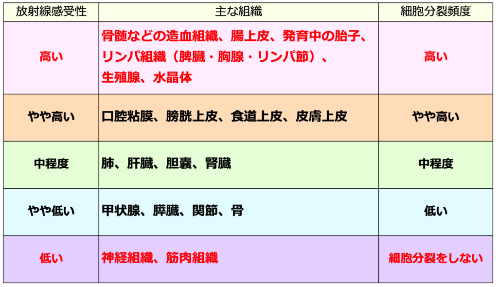 ◉放射線の感受性一覧表はこちら👇