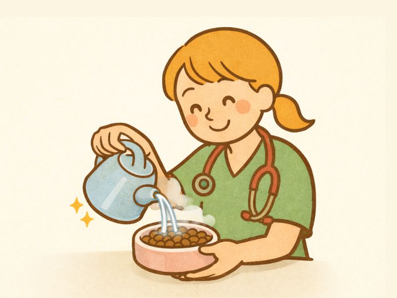 少しぬるま湯をかけるだけで、食べやすさが変わり、落ち着いて食べる子が増えます。