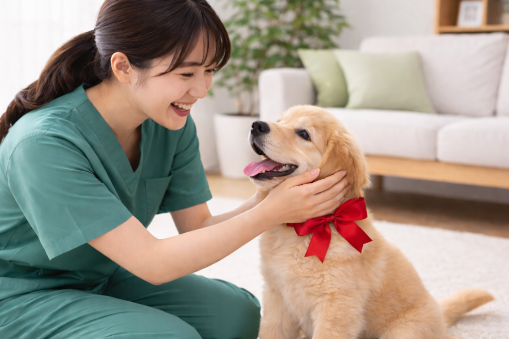 愛犬と目を合わせて、優しく触れ合う――その一瞬に、信頼と安心がぎゅっと詰まっています。