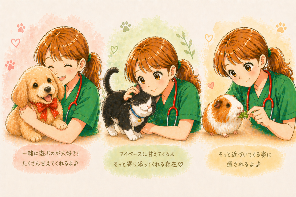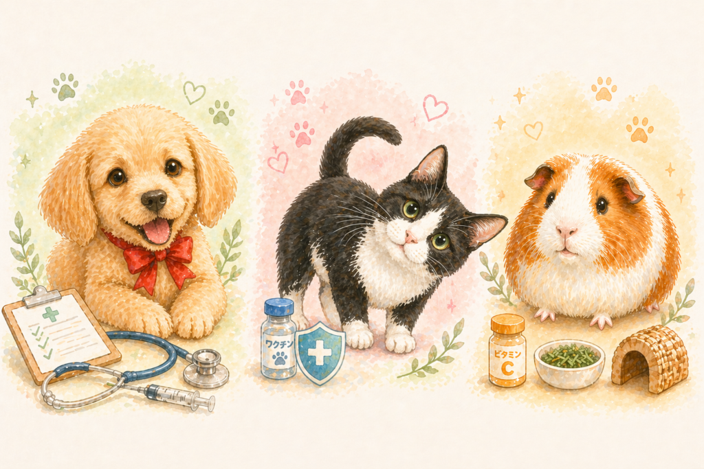 | 項目 | 🐶犬(小型犬) | 🐱猫(短毛の子) | 🐹モルモット |