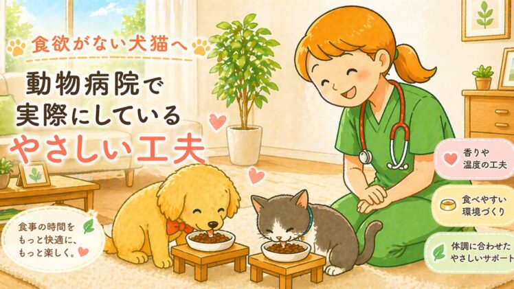 ネコちゃん 食欲がない犬猫へ🐾動物病院で実際にしているやさしい工夫 食欲がない犬や猫にどう対応すればいい?動物病院で実際に行っているやさしい工夫をもとに、自宅でできるサポート方法や受診の目安をわかりやすく解説します。 2026.04.21 ネコちゃんワンちゃんワンニャン健康サポート